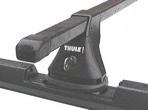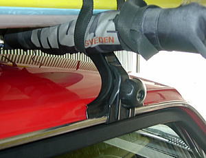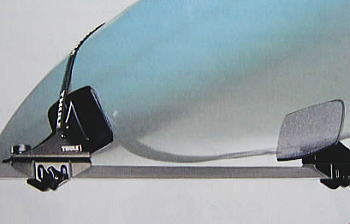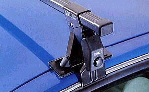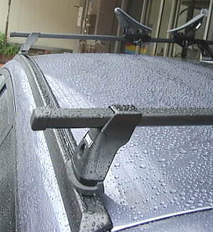 写真の左側リアベースキャリアは、ルーフに載っているだけ。 前後ベースキャリアを縦バーで結び、そのクランプフットがルーフを掴んでいる。 750フット用の777. |