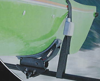 | カヤックアタッチメントに正しく積載していれば、安定していますが、万一のことを考えたら、前後にタイダウンロープをセットしておくべきです。 メリットは ★ 急ブレーキをかけたさい、飛び出さない。 ★ ダートやギャップの衝撃でシーソー状に動かない。 ★ もしカヤックキャリアが壊れたり、ベルトが外れたりした場合、カヤックを落とす可能性が減少する。 ★ メインキャリアの取りつけ前後スパンが極端に短いクルマは必ず縛りましょう! (写真例はMR2) |