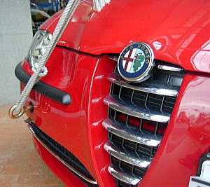 太さは6mm以上のロープを使います。 カヤック側はグラブループに、 クルマ側はバンパーか、牽引ロープ用フックにかけます。 最近のクルマは写真のように、ヒートンをネジ込むタイプも増えています。 (写真は井上さんのアルファロメオ) |