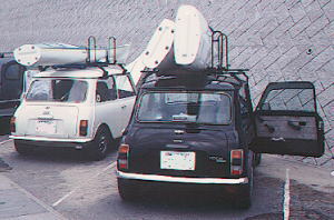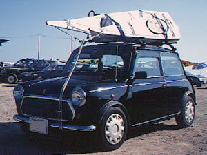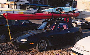 ユーノス・ロードスターに、特注キャリアつけて、それにスーリーのメインバーつけてpパフィンを積んだ。 特注キャリアの足は、フロントはウインド上部の猫の額ほどのスペースに吸盤のフット、でベルトのテンションで固定。足のリヤ側はコクピット後部のネジ部に長ボルトで固定。 |