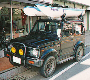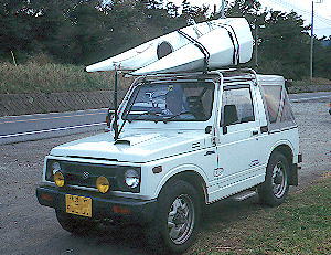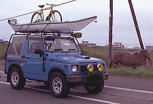 yoshimura先生の幌ジムニ−。キャリアはカスタムです。通称青ジム君。 『これは92年の8月に道東の霧多布で撮影したものです。寒くてヒーターを入れたのを今でも覚えています。根室駅前の食堂で食ったサンマの刺身もうまかった!!ちなみに積んでいた艇はNanokRT、自転車はアルプスのパスハンターです。』 (写真提供:yoshimura氏) |