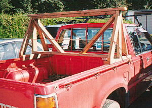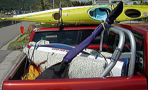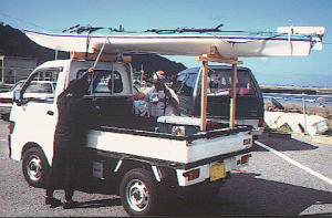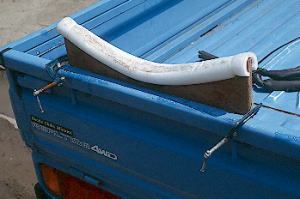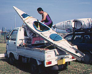 軽トラックに斜にダイレクトに縛りつけてしまう和佐間さん。仕事師の縛りだね! カヤックはネッキ−・スワロー パッドはウエス |