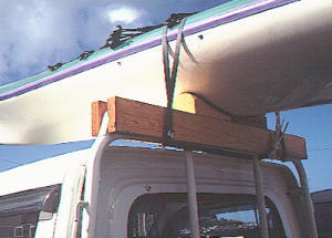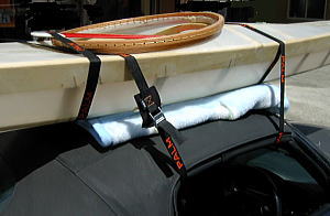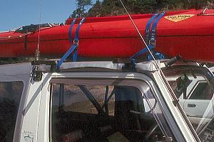 前側はフロント・ウインドウ上に水道工事用ウレタンパッドをかませているだけです。 キャリア・ベルトはセンターピラーの箇所のみ。 前後牽引用フックからロープを出して、バウとスターンを固定しました。 なおキャリア・ベルトはシットオンのニーベルトの間を通して、急ブレーキで飛ばないようにしています。 |