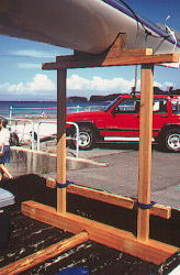hayasiさんがお世話になっているogawaさんのハンドメイドのウッド製ラック。 カヤックのハルにみごとに合わせている。 ogawaさんは県でも有数の工芸家。そごうで個展もやるようなお方です。 するとこのラックは一体いくらに!?(^^;) ラック固定はゴムロープ。 カヤックはネッキ−・アルラックIV |