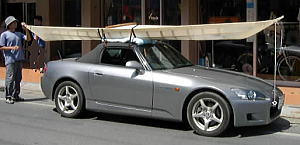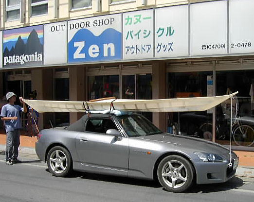 higaさんのホンダS-2000! ルーフキャリアはありません! 超軽量15kgくらいの自作スキンカヤック だから許される。 ハイテクとローテクのみごとな調和!! ナンバー横にヒートンがねじ込まれている。 |