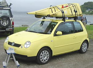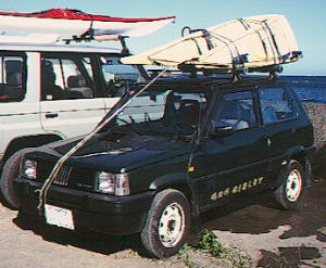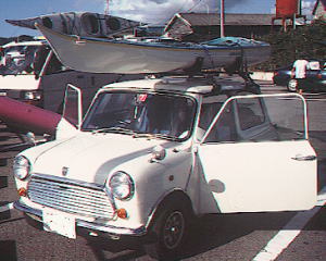 AZEちゃん、下のパンダからワーゲン・ルポに変更。 3ピースのセドナを2分割状態でカートップ。 同色のレモンイエローでキメテいます。 これは雑誌ターザン取材の時です。 |