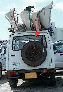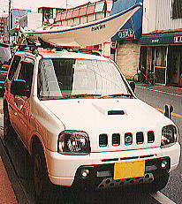 以前サブ・カーとして使われていたドカタ仕様のジムニ−。メインカーが修理中はフルサイズのシーカヤックを4艇積んでがんばりました。 縦アタッチメントを左端に、セドナ・ポーラー・ショアライン・シーフォックスの順に積んでます。うまく積めました。うーん、積み過ぎかなあ! |