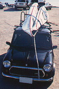 iizimaさんのミニにセドナ3ピースを2分割状態で積載。2分割で長さが車長にピッタリ同じ。スターンセクションのみ切り離しています。 クサビ状になっているので、先端部でロープで強く引いています。 |
