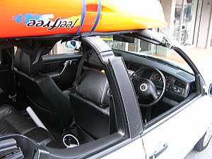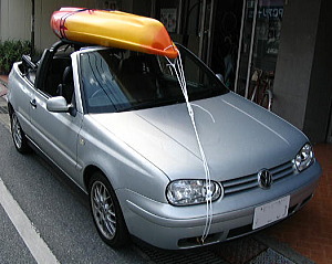 Makiさんのオープンのワーゲン・ゴルフ・カブリオレ シットオンのムーブをキャリア無しのじか乗せです。 屋根がカヌーです!! |