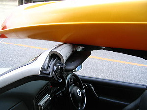 ワーゲン・ゴルフ・カブリオレには 強力なセンターピラーロールバー(?)が装備されてます。 横転しても大丈夫なくらいの強度があるそうです。 それ自体がキャリアの代わりです。幌が上にセットされるため、ウレタンパッドが付けられているので、それに直接置いてます。滑り止めメッシュを置いたほうがモア・ベター。 裏返し積みです。 |