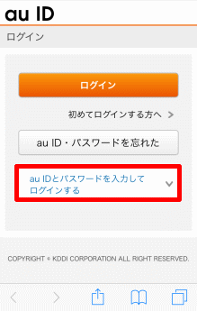 | A「au IDとパスワードを入力してログインする」をタップします。 ※ログイン済みの場合は[手順5]に進みます。 注意 au IDでのログイン時にLTE/3G接続でない場合(=Wi-Fi接続の場合)、「二段階認証」でのログインが必要な場合があります。 二段階認証:Wi-Fi接続時や、パソコンなど他の端末でログインする場合は、au IDに登録されているau携帯電話にSMS(Cメール)でURLが送付されます。 SMS(Cメール)上のURLをクリックすると認証画面が開き、「許可」ボタンを押下して認証許可を行っていたくことで、ログインできるようになります。 ※一度認証許可を行えば、そのログイン端末では100日間二段階認証がスキップされます。 (au IDに登録されているau携帯電話で、LTE/3G回線を利用してログインを行う場合、上記のような二段階認証の操作は不要です) |