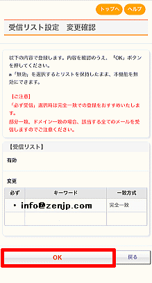 | F「受信リスト設定 変更確認」画面が表示されますので、間違いがなければ「OK」をタップしてください。 「必ず受信」選択時は完全一致での登録をお勧めします。部分一致、ドメイン一致の場合、該当する全てのメールを受信しますのでご注意ください。 |