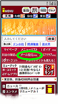 | @ iモードに接続すると最初に表示されるトップページ「iMenu」からメール設定をクリック |