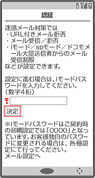 | B「認証」画面にて、iモードパスワードを入力し、「決定」を選択します。 iモードパスワードは、ご契約時「0000」と設定されておりますが、ユーザーご自身で変更することをおすすめします。 |
