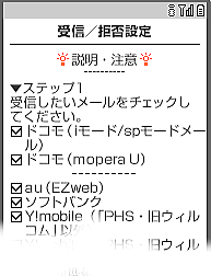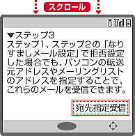 | D「受信/拒否設定」画面では、ステップ1からずーとスクロールして、ステップ3でメールアドレスを設定します。 ステップ3の「宛先指定受信」をクリックします。 ステップ3では、ステップ1および2の「なりすましメール設定」にて「なりすましメール」とみなされてしまうメーリングリストやメール転送サービスを経由したメールを受信設定することができます。 |