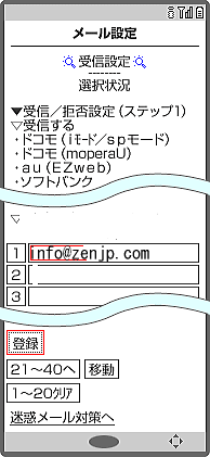 | E受信したいメールアドレスを入力後、「登録」を選択し、設定完了です。 info@zzenjp.com すみません、コピペのさいに「z」をひとつ削除してください。「zen」です。 ドットは一箇所のみです。 |