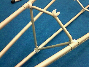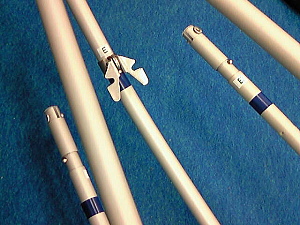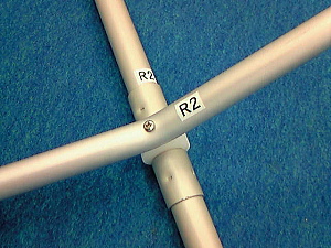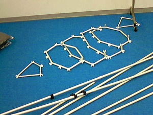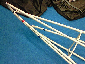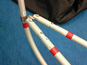 12. リブ1と6をGパイプに結合させ、Kパイプ(キール)にも取り付けます。そのさい、Kパイプと直角になるように。 リブの前後に注意してください。 |