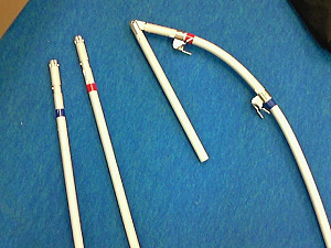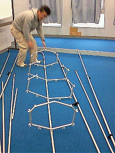 2. 中身を出して、仕分けしておきます。 直線的なパイプと○型のリブ パイプの前後を揃えたり、長い物をつなげておいたり、リブは順にしておくのがモアベター。 ところでテントのポールもそうですが、パイプをジョイントしたり、外す時は水平に持ってやると、両端がたわんでその応力がジョイント部にくるのでやりにくいです。 斜めに持ってやるのが正しいやり方です。 |