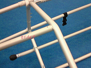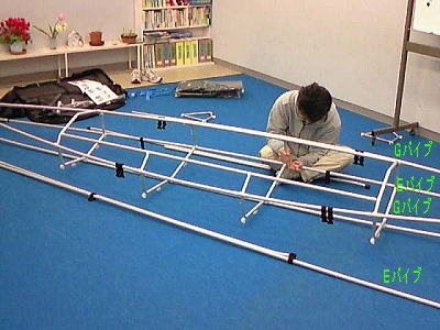 9. 赤テープのGパイプの先端をKパイプ(キール)の金具Aタングに付けます。