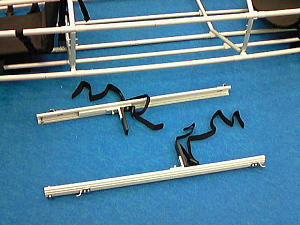 7. オプションでラダーを付ける方はここでスライドペダルのレールを付けます。 一人乗りと二人乗りでレールが区別されてるし、取り付け位置も違うので注意してください。 ボルトの出てるほうが前にきます。 写真はあらかた組んでしまい、ペダルレールが入らないの図。とほほ、(><)