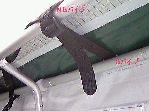 座面の3本のテープの両端の2本はGパイプへ、中央のテープはEパイプのシートループと接続します。
