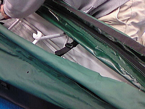 18. 前後を間違えないように船体布にフレームを挿入します。 センターに注意してKパイプがキールレールに収まるように。 フレームはなるべく前に強く押し出します。 キールレールから外れて組むと変なクセが付くので注意! フレームを入れたらコーミングベルトをチェックします。Gパイプの上に出しておきます。八箇所。 ファスナーバックアップベルトも同様です。 3,4つ下の工程参照。 |