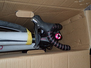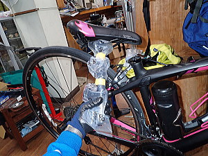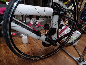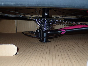 | 1) ライトやサイコンなどハンドル周りの装備を取り外す。 2) リアのギアを一番内側(ロー:軽い側)にする。 (後輪は外しません。Rメカを守るためにローに入れます) 3) 変速機ガードをスプロケットとフレームのエンドの間に挟みます。 4) ペダルを外す。 詳しくはこちら。 5) サドルを外す。 6) 前のブレーキワイヤーのクイックを外す。 (Vブレーキの場合はココ参照) 7) 前クイックシャフトを抜き、前輪を外します。 8) ハブ中空シャフトに保護キャップを被せる。 保護キャップは平らな方が箱側(外側)。 丸い方がフレーム側です。 9) 前フォークエンドにガードを挟む。 10) 前輪をフレーム左に位置させる。 幅を狭くするために、左クランクを前向きにして、スポークの中に入れます。 車輪とフレームをベルトかマスキングテープで固定するのがモアベター。 11) 段ボール箱に入れる。 12) ハンドル・ステムを外す。 ⇒外し方・ヘッド調整 13) ハンドルは隙間に、サドル&ポストも隙間に。 14) 外したペダル類は忘れずに中に入れます。 |