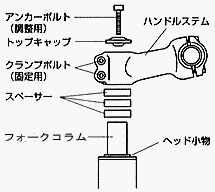 | フォークコラム外側にネジは無く、スペーサーやステムが嵌っていて、アンカーボルトでベアリングの入ってるヘッド小物に押付けられ、クランプボルトでフォークコラムにステムが固定されるようになってます。 もしもスペーサーを紛失してコラムがステム上面よりも長い場合にはベアリング調整は不可能となります。 昔のステムしか知らない人は、アンカーボルトを思い切り締め付けてステムを固定しようとするかもしれませんが、壊してしまいます。 アンカーボルトは軽く締め、固定はあくまでクランプボルトです。 (スペーサ枚数は各々違います。 使ってない場合もあります。 トップキャップとステムの間にある場合は、位置を間違えないように) |