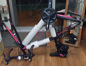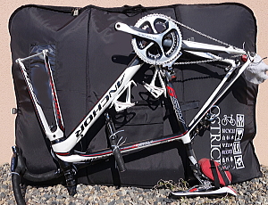 | 飛行機輪行は、出発空港で預けたあと、到着空港で受け取るまでは、自分の自転車がどんな扱いを受けているかを知ることはできません。 他の荷物の下になったり、放り投げられたりすることもあるかもしれません。 せっかく出かけた先で走れなかったら、金銭では換えられない無念さがあります。 そんなトラブルがないように、飛行機輪行にはできるだけのことをやっておいた方がいいですね。 入れ物はハードケースがベストですが、普通の人が使うにはちょっと現実離れしています。 普通の輪行袋でも可能ですが、オーストリッチ「OS-500トラベルバッグ」がモアベターな選択です。 厚さ10mmのウレタンでプロテクション効果を高め、航空便にも対応しています。 実業団選手らも遠征で使っています。 ただしこのバッグは畳んでも大きいので、サイクリング中に携行するのは無理です。預けておけるシチュエーションにのみ有効です。 |
