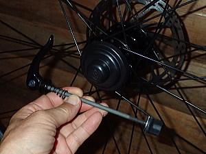 9) 後輪のクイックを抜き、後輪を外す。 中空ハブ軸外側を保護するのがモアベター。 |