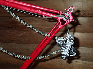 | 10) リヤ・ディレイラーを外す。 5mmもしくは6mmヘックスで外せます。 必ず車輪を外してからでないと、チェーンのテンションが高くてまずいです。 外したRDはエアキャップで包みマスキングテープで固定。 |
