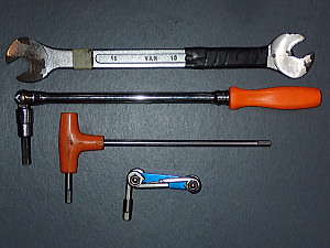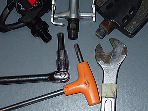 | ペダル用工具はペダルによって種類が違います。 左から ・8mmヘックス、 ・6mmヘックス ・トラディショナルな15mmペダルレンチ、 の三種類。 |