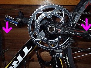| ネジは通常は右回転で締まります。 しかし、左のペダルは逆ネジになってるので、逆回転です。 どっちだったっけとゴッチャになることがあります。 車輪の回転と同じ方向で締まる、と覚えておいてください。 |