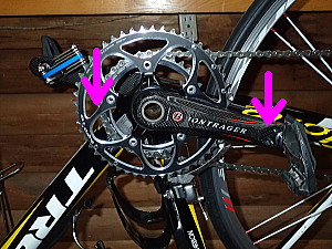 | 締める場合は、 右・左どちらのペダルでも、クランクを進行方向に向け、 工具は後ろ方向へ向けて、上から体重を掛けて締めます。 同時に、外さない側のクランクも上から押さえて動かないように。 |