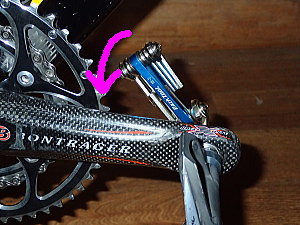| 締めこむ場合は、(ペダルをクランクにネジこんで最後トルクを掛ける時)クランクを前方に水平に位置させます。 工具は2〜3時の位置が力を入れやすい位置です。 上から工具に体重を掛けて回します。 車輪回転方向に力を掛けます。 写真は右ペダルですが、左ペダルでも、クランク位置と工具位置、力を掛ける方向はまったく同じです。 小さな携帯工具では、体重を掛けてしっかり締めこんでください。 ただし! クランク内側で工具を使う場合、工具によってはやりにくいことがあります。 その場合は自転車を倒立させてから行なう方法もあります。 |