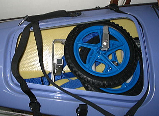 | これならダブル用の大形メインフレームもバリーのフロント丸ハッチ(内径188mm)に入ります。こちらにはサポーター・フレームも入れます。 さすがに車輪は丸ハッチには入らないので、リヤハッチに収めます。 ダブル用はもちろん、シングル用の改造でも前ハッチを有効に使えるようになるので吉です! 前ハッチはけっこうカラで使わないこと多いですからね。 なお写真では見える位置にキャリーを置いていますが、このP&Hシリウスで、さらに先端に移動できて、ハッチの真下と後部はまるまるラゲージスペースとして使えます。 |