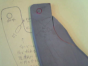 最後、カーブのきついとこは鋸をしなわせて切っていきます。 普通の鋸だとブレードを支えているフレームが邪魔で切れません。 写真をよーく見てください。 この鋸はブレードの取り付け角度を変えられるので、フレームを逃がして切ることができます。 |