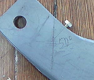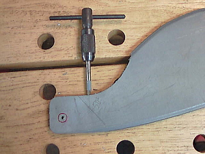 最終曲線部を切り落としたら、今度はケーブルストッパーを設けます。 この部分は年式で変遷があります。 初期には、最初の写真の下絵にあるように、楕円の穴が開いていて、そこに出たケーブルの末端を金属のカミツブシで膨らませてストッパーにしていました。しかし、穴が大きいため、その部分に応力が集中して、そこで折れてしまいました。 今回はボルトでケーブルを押さえることにしました。 別の穴をあけて、そこにタップをたてます(ネジ山をつくる)。 |