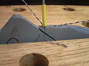 でもここでストップ! 昇降ケーブルを通す穴を開けなくてはなりません。 その穴は切断面に50度の角度で斜めにあけます。ドリルを狙い通りの角度に入れるには滑ってしまいます。 そこで、すべて切り取ってしまう前に、ドリル穴との直角面を余材に設けておきました。 穴の深さも決めているので、ドリルに黄色いテープを巻いてそれ以上深く掘らないようにしておきます。 |
