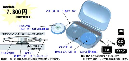 | セラミックスピーカーユニットを何かに貼りつけると、その物自体を振動させて音を出す新しいスピーカーシステムです。! さっそく買ってみました! 机やドア、はたまたカヤックから音楽が聞こえるのです。実におもしろい! |