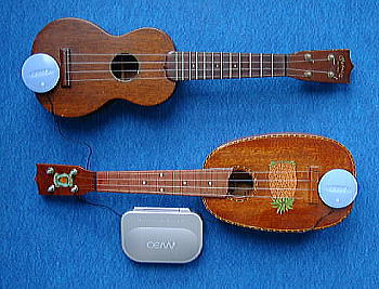 ところで、ウクレレをスピーカーにして鳴らすとすごい! いい音がでます! 単にスピーカーとしてだけではなく、色々なメリットがあります。 ・ 木に振動を与えて、楽器を熟成させられる! ・ 名プレーヤーの演奏が自分の楽器から出る! ウクレレを抱えて、弾かずに音楽を流しているだけで、気分は・・・!!(^^) ・ 一緒に弾いて練習! 世界の名プレーヤーが自分と共演してくれる! ・ 伴奏テープ作って、アウトドアで自分の伴奏させる! マーチンのスタイル0とカマカのオールドに付けたところ。素材によってマホガニーとハワイアン・コアでは音が微妙に違う。 |
