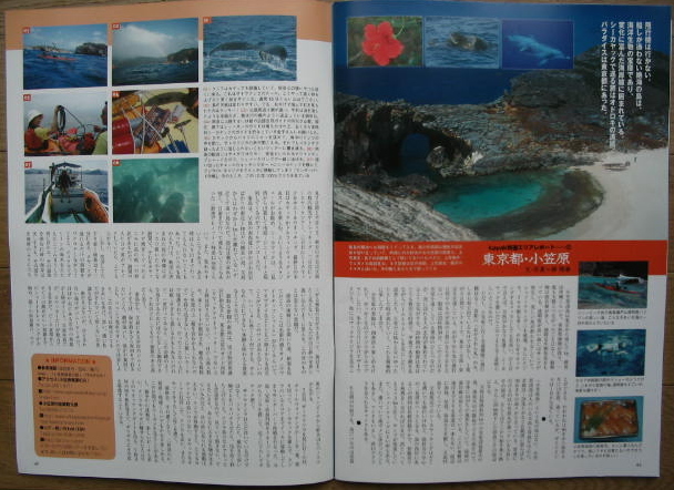 カメラは、一眼レフ(銀塩フィルム/キャノン・イオス55)・水中カメラのニコノス・コンパクトデジカメ(キャノン・パワーショットA75)を持って行きました(重いっ!) 以前雑誌の表紙写真を撮る仕事などをしていました頃は、レンズはツアイス(CONTAX)フィルムはコダクローム65とこだわっていました。 前は雑誌の写真原稿にはリバーサルフィルム!だったのですが、いまやデジタル時代。 今回リバーサルで撮ったカットもスキャンしてデータ化して使っています。けっこう大きなデータです。 しかし!今回コンパクトデジカメで撮影したカットが2枚使われています。それも最低の画素数、最低の解像度設定で撮ってます。よく印刷に使えるもんだと感心! さて、どのカットでしょうか? 答えは下に |