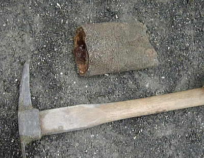 かなりボリュームの大きなものですね。なんてったってクジラの骨ですから。 市宿層は若い地層なので、岩石ハンマーよりも、スコップや潮干狩りクマデの方が有効です。 |