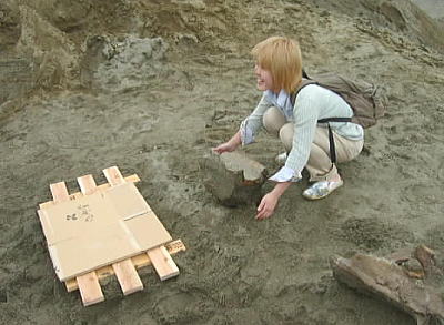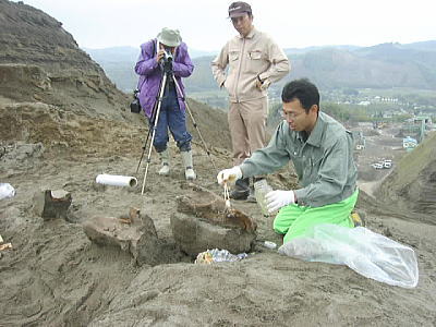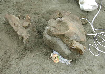 どこの部分でしょうか? けっこうな塊の骨です。 でも残念ながら、もっと大物の骨は前日に搬出されてしまったそうです。上の新聞内の写真を参照ください。 |