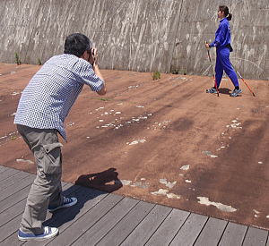 取材当日、フォームの撮影風景 モデルは自転車ツーリングによく参加してくれるまりこさんに頼みました。 彼女はカーボン・ポールをGetしてノルディックウォーキングにはまっています。 |