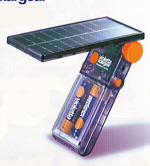こちらは4本の二カド単3電池専用の充電器。(ニッケル水素電池不可) 二カド単3電池(1,2V/500mAh)4本をなんと約2時間で急速充電してしまうタイプ。 太陽電池、システム機器は京セラ製。 こちらはマップケースか小型防水バッグに入れてデッキ上に装着してチャージする。 ・出力:1,72W(1,84V/940mA) ・収納サイズ:22X13X3,5cm ・質量:230g ・価格¥13000 |