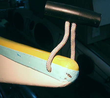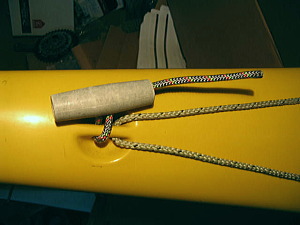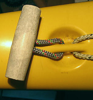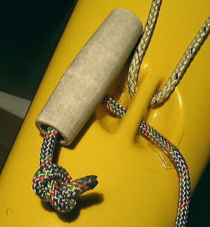 ロープの端部を結びます。 ロープをひと結びするのにどのくらいの長さが必要でしょうか? 9cmは必要です。 結び目をトグルの中に収めます。 ロープをカヤックに通します。写真のモデルで1cmの通し幅。セドナはこの中にステンレスのシャフトが入っています。 この幅によってロープの長さも変わってきます。 |