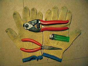 使った道具 ・ワイヤーカッター(ナイフでOK) ・ライター ・ロングノース・プライヤー ・軍手 |