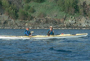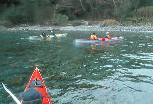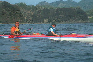 | 行きは潮に乗って快適だったけど、釣浜からの帰りは逆潮!しかも向かい風!たまにパドルがあおられるくらい吹きつけられました。 コースは岸ベタで遡る。流れの中央が流速が速く、岸近くは摩擦と反流で遅くなっている。 しかし水面はラフだ。 かなり気合を入れないと、漕いでも漕いでも、ほとんど止まっているルームランナー状態の所がありました。 狭い海峡を風が吹きぬけているので、パドリングピッチがのろくなれば、逆に押し流されます! さすがにその時は写真など撮っていられなかったです。 ガイドの金子さんは、朝のミーティングでコースを悩んでいた。 兄島瀬戸。 帰りに遡れなくて押し戻されたら、カヤックを釣浜に置いて、山道を歩いて帰ろう。そんな覚悟で来た難所だった。 タンデムの乗員組み合わせを前日と変更して、力の平均化をはかった。写真班のセツは林女史と組んでいたが、今回はaikoさんと組んだ。あの向かい風の中で、パドリングペースが落ちなかったのはお見事! 彼女はグングン上達しているね。 林さんはタカさんと、サッチャンは金子さんと、といった組合せだった。 後で、金子さんは、あの潮流と向かい風で全員漕ぎ登れると思わなかった、とボソっと言っていた。 みんなよくがんばりました。 |