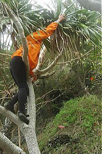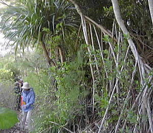 | 3日目 予定ではサンダーバード作戦でホエールウオッチングでしたが、船を出せないほど荒れていたので、トレッキングに変更です。 タコノキのジャングルで |